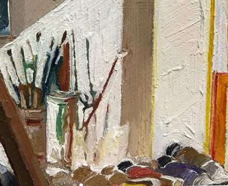 These are not paintings of a photograph; instead, I use numerous photographic references, drawings, and layered projections, and the composition builds perceptually. Some areas develop in the same way as my conversation with the subjects in them: there is a central thought that guides the idea, the setting, and the pose. Other areas develop by drawing symbolic objects as I remember them and reflect moments when the subjects present themselves spontaneously and without artifice, when the idea and the image evolve unplanned and editing-out is unnecessary. And in other areas still, I add light to fragment forms and deconstruct spaces, reordering their appearance and adding personal meaning. While painting I focus on the material quality of thick, lumpy, grog-like paint continuing to add or subtract excess information.