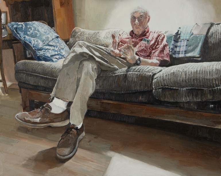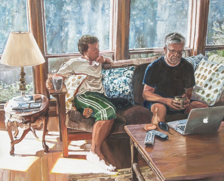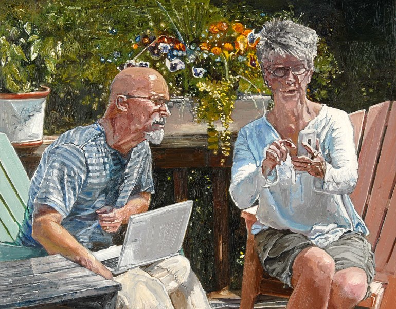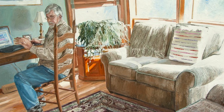 “Waiting for the Philosopher King” (18″x36″) I captured this view of Bruce, my husband, after yet another conversation we