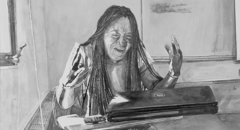 “Why I Can’t Talk About Race to White People” (14″x26″) Shavon demonstrates to me what it feels like (at